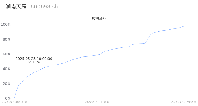 600698湖南天雁2025年05月23日成交122.73万手,成交金额9.01亿,相较昨日缩量21.90万手,换手率14.78%,成交活跃。