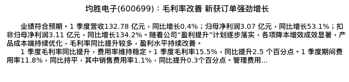 值得注意的是:2024年04月东方证券的姜雪晴/袁俊轩分析师,首次发布关于均胜电子的研究报告,标题为:均胜电子(600699):毛利率改善 新获订单强劲增长。
