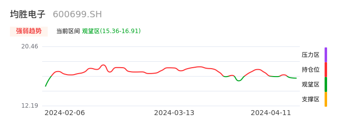 我们来看一下该股的九方特色指标强弱趋势的情况:均胜电子近日从持仓区下穿到观望区,股价出现持续性调整行情。短期已经转为空头行情,且下跌动能仍未衰竭。建议继续谨慎观望。