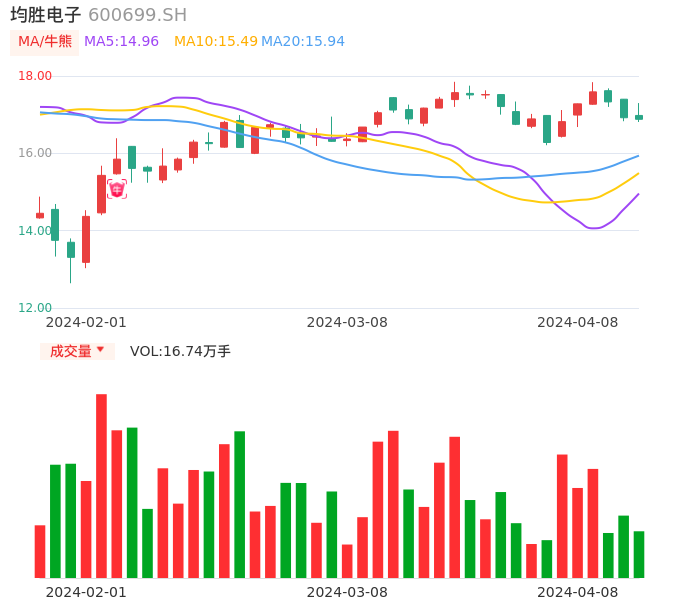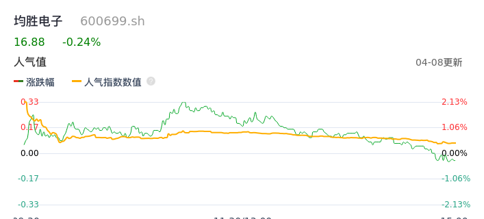 04月08日,均胜电子收报16.88,股价涨幅-0.24%,成交金额2.86亿元,换手率1.22%。
