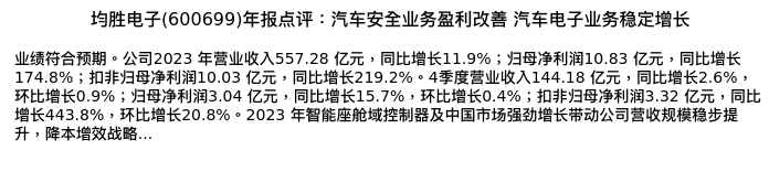 值得注意的是:2024年04月东方证券的分析师,首次发布关于均胜电子的研究报告,标题为:均胜电子(600699)年报点评:汽车安全业务盈利改善 汽车电子业务稳定增长。