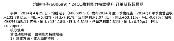 值得注意的是:2024年05月华安证券的姜肖伟分析师,首次发布关于均胜电子的研究报告,标题为:均胜电子(600699):24Q1盈利能力持续提升 订单获取超预期。