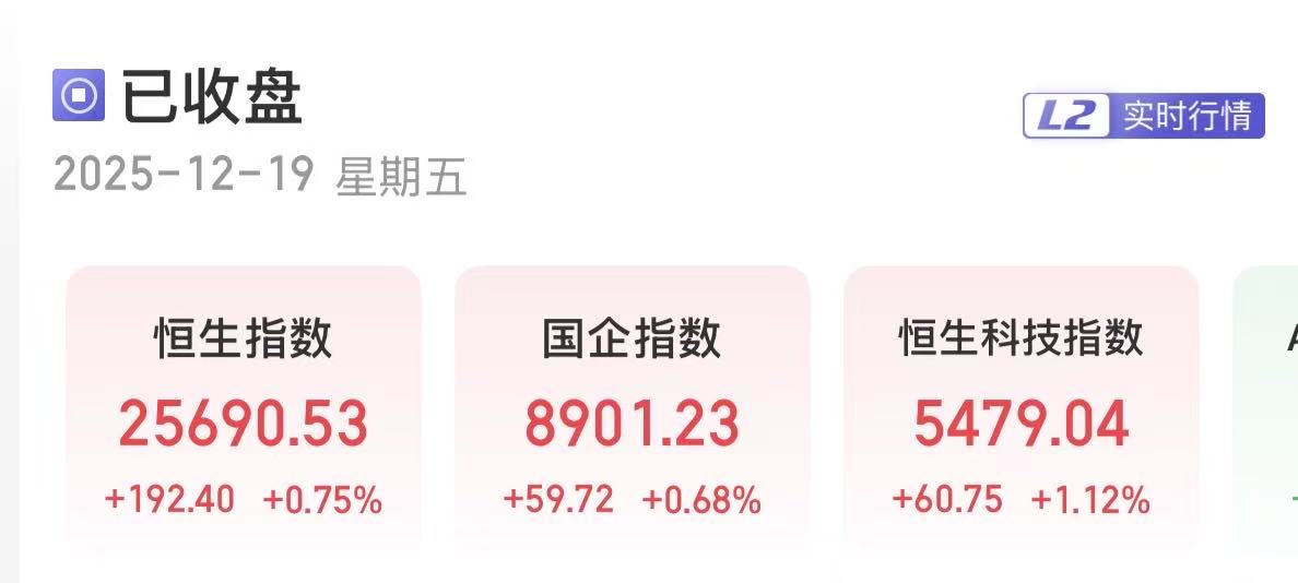 上证报中国证券网讯12月19日,港股三大指数集体收涨。截至收盘,恒生指数涨0.75%,报25690.53点;恒生国企指数涨0.68%,报8901.23点;恒生科技指数涨1.12%,报5479.04点。