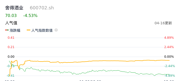 04月16日,舍得酒业收报70.03,股价涨幅-4.53%,成交金额5.73亿元,换手率2.44%。