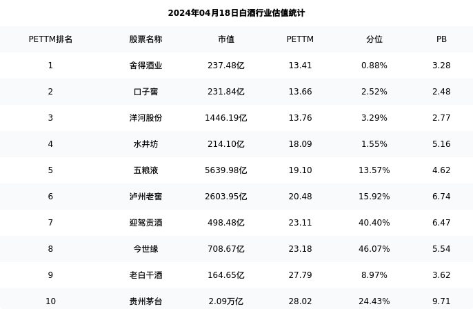 从估值角度看:舍得酒业最新市盈率PETTM为13.41,在行业内排名1/20,处于0.88分位。
