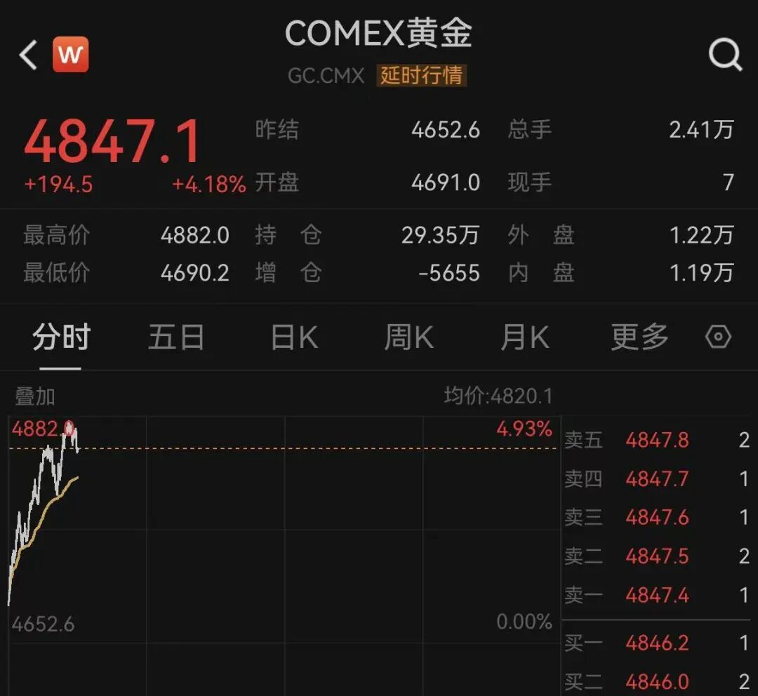 国际期货市场方面,贵金属迎来大幅拉升。截至发稿,纽约期银日内涨超11%,现报85.60美元/盎司。纽约期金突破4880美元/盎司,日内涨超4%。
