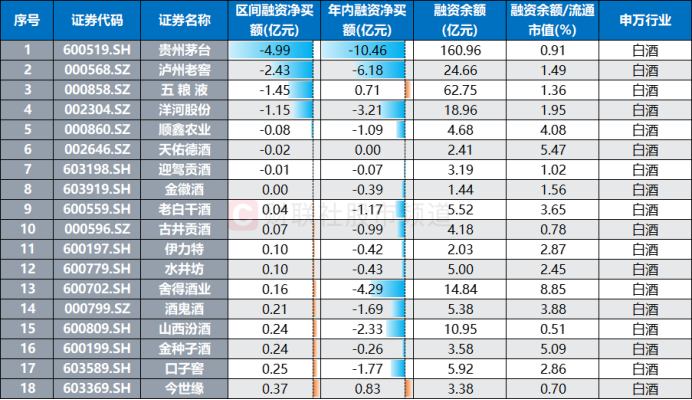 从整个板块来看,同样以6月18日至目前(7月1日)数据统计,除贵州茅台外,泸州老窖、五粮液、洋河股份近期也遭融资客重点减持,融资净卖额分别达2.4亿元、1.5亿元、1.2亿元。若以全年融资余额变动统计,在整个白酒股中,贵州茅台、泸州老窖、舍得酒业、洋河股份、山西汾酒年内融资净卖额居前,另有口子窖等4股净卖额也在1亿元以上。