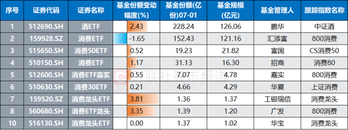 注:基金规模居前的白酒类ETF近期基金份额变动情况(截至7月1日数据)