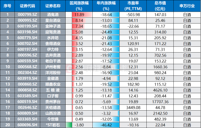 虽然白酒板块近期整体陷入震荡走势,但部分个股仍在近日表现相对活跃。截至今日收盘,以6月18日以来行情统计,20只白酒股平均上涨近2.91%,中位数涨幅2.52%。其中,酒鬼酒、皇台酒业、金种子酒分别上涨近11.9%、8.1%、7.3%。而*ST岩石唯一收跌,跌幅近3.8%,今世缘、山西汾酒、天佑德酒、贵州茅台、口子窖5股近期涨幅则均不足1%。
