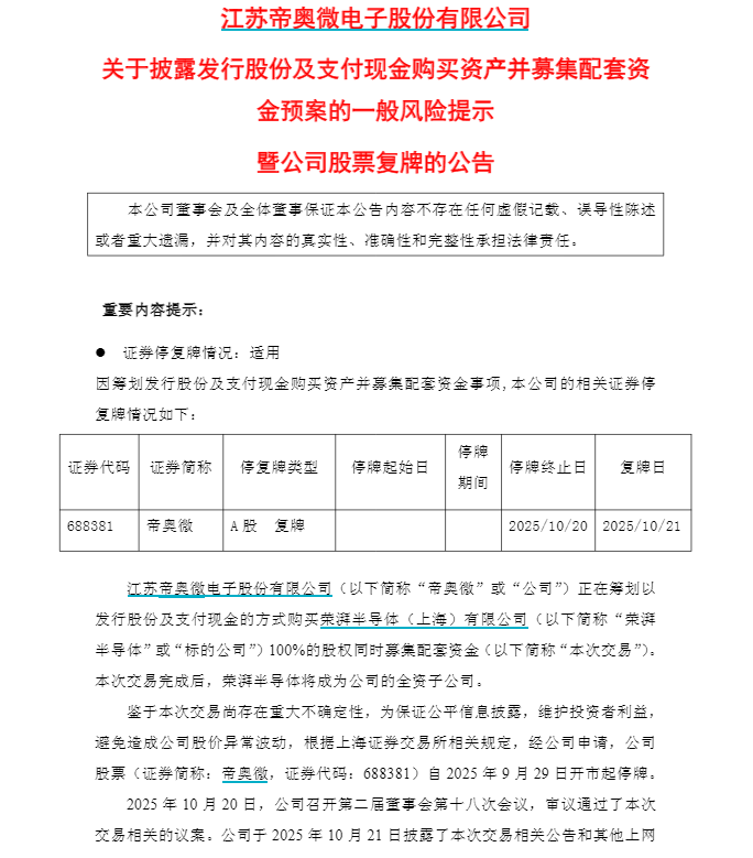 10月20日晚,帝奥微(688381)发布多条公告。公告显示,公司拟通过发行股份及支付现金的方式购买董志伟等所持荣湃半导体(上海)有限公司(简称“荣湃半导体”)100%股权,同时拟向不超过35名符合条件的特定投资者非公开发行股票募集配套资金。公司股票将于2025年10月21日开市起复牌。