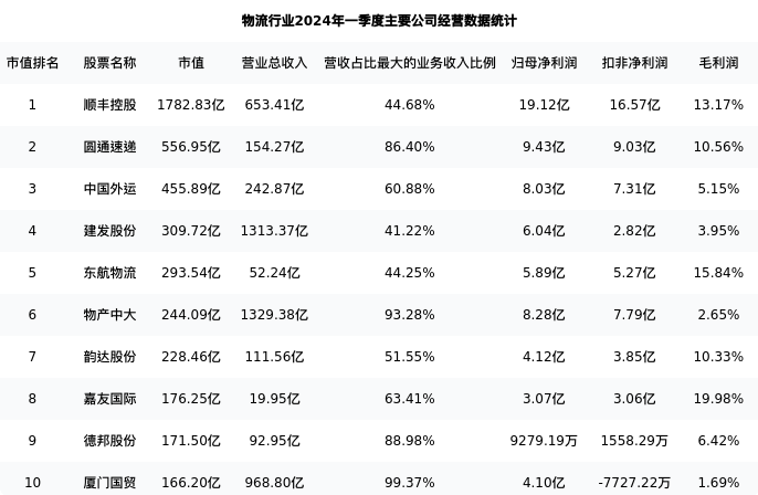 物产中大最新报告期数据为一季度,下表汇总了物流行业内市值靠前的公司一季度主要经营数据