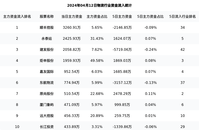从主力资金流向来看,物流行业今日主力资金流入10.15亿元,在所有申万二级行业中排名:97/131。