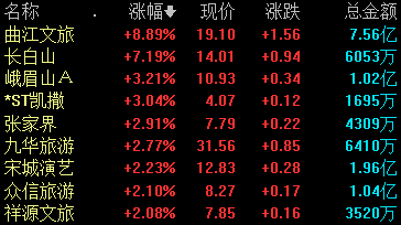 9月15日,景点及旅游板块震荡走高,截至发稿,曲江文旅涨近9%,长白山、张家界、九华旅游等跟涨。