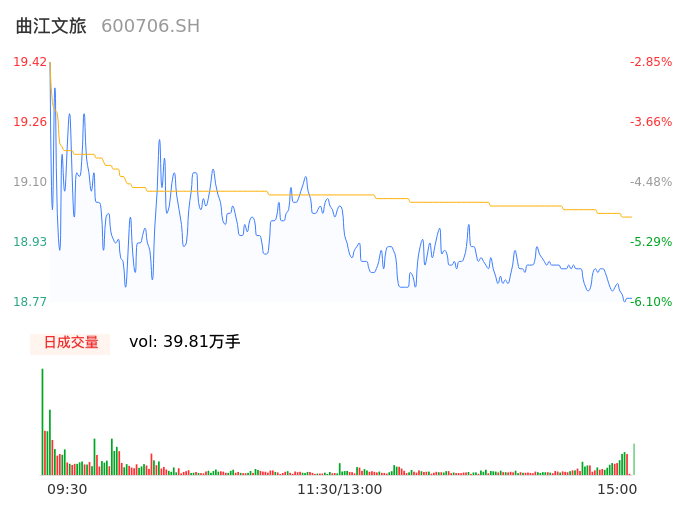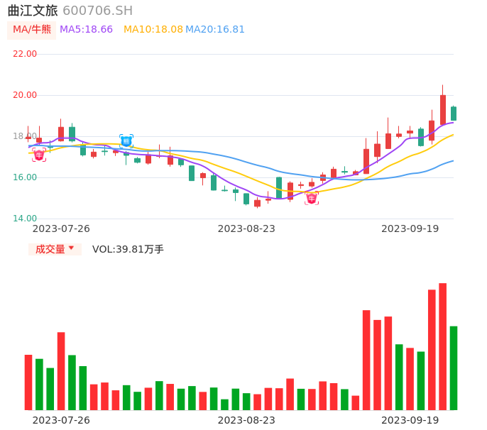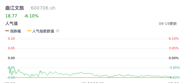 09月19日,曲江文旅收报18.77,股价涨幅-6.10%,成交金额7.56亿元,换手率15.67%。