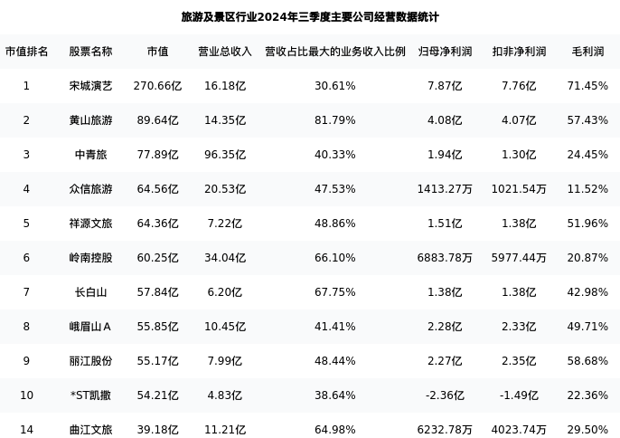 曲江文旅最新报告期数据为三季度,下表汇总了旅游及景区行业内市值靠前的公司三季度主要经营数据