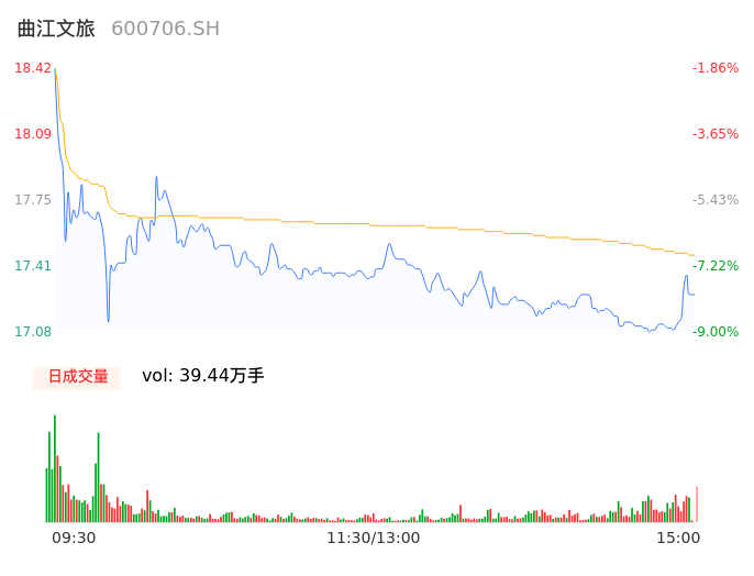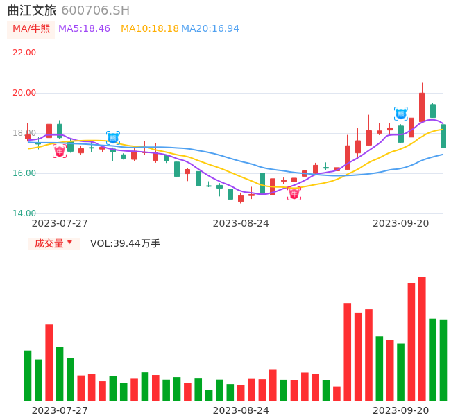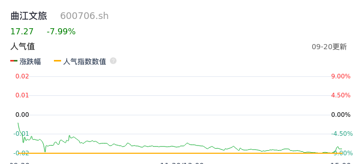 09月20日,曲江文旅收报17.27,股价涨幅-7.99%,成交金额6.89亿元,换手率15.53%。