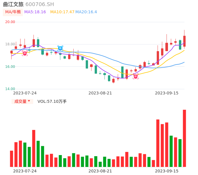 09月15日,曲江文旅收报18.75,股价涨幅6.90%,成交金额10.66亿元,换手率22.48%。