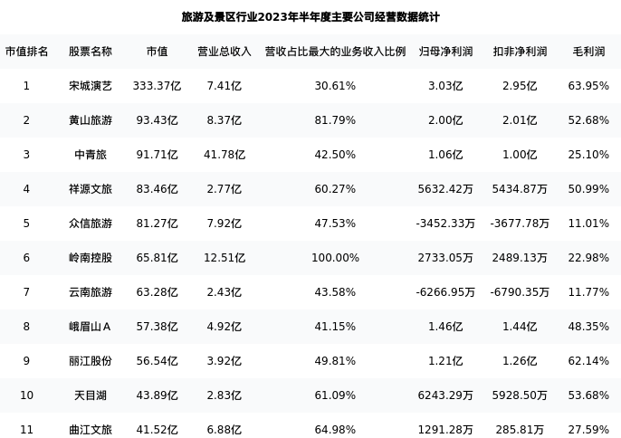曲江文旅最新报告期数据为半年度,下表汇总了旅游及景区行业内市值靠前的公司半年度主要经营数据