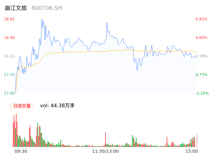 09月11日,曲江文旅收报18.12,股价涨幅2.84%,成交金额8.08亿元,换手率17.47%。