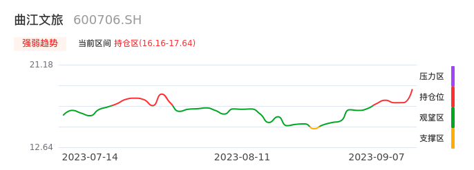 我们来看一下该股的九方特色指标强弱趋势的情况:曲江文旅自09月01日从观望区上穿到持仓区。股价近期在多头区域持续强势上扬。上升动能仍较为充足,可积极持股。后续重点关注上方压力位:17.64元是否能突破上攻。