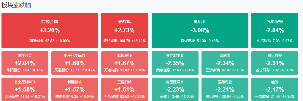 板块方面,能源金属、光刻机、影视院线等板块涨幅居前,机器人、地产等板块跌幅居前。截至收盘,沪指跌0.03%,深成指涨0.32%,创业板指涨0.16%。