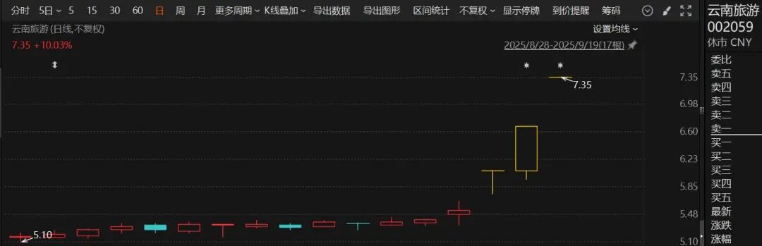 另外,随着中秋、国庆长假的临近,旅游股频频走强,板块指数在市场调整的时候连续逆市大涨,并创4年半新高。云南旅游连续3日涨停,曲江文旅连续2日涨停,桂林旅游周五午后也快速拉涨停,西域旅游则创历史新高(复权)。