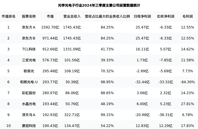 彩虹股份最新报告期数据为三季度,下表汇总了光学光电子行业内市值靠前的公司三季度主要经营数据