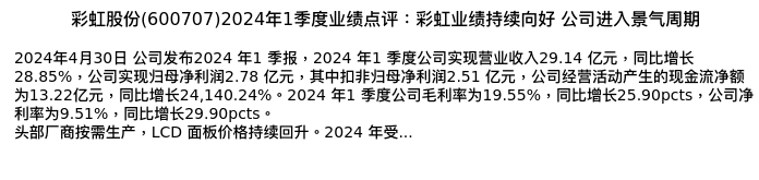 值得注意的是:2024年05月东北证券的李玖/李明分析师,首次发布关于彩虹股份的研究报告,标题为:彩虹股份(600707)2024年1季度业绩点评:彩虹业绩持续向好 公司进入景气周期。