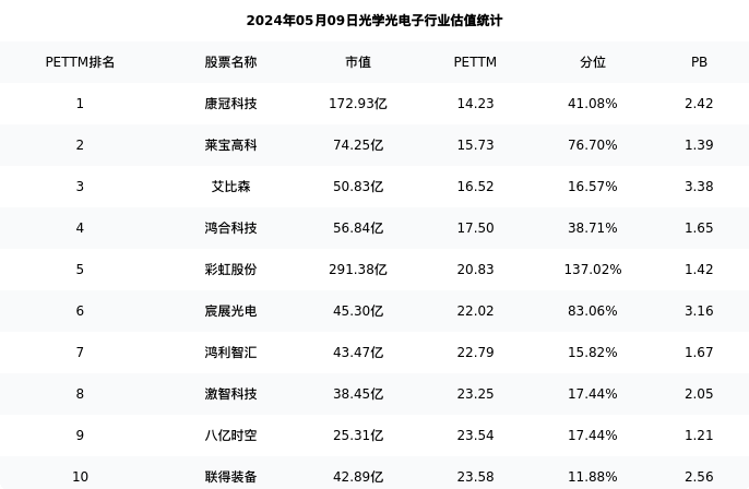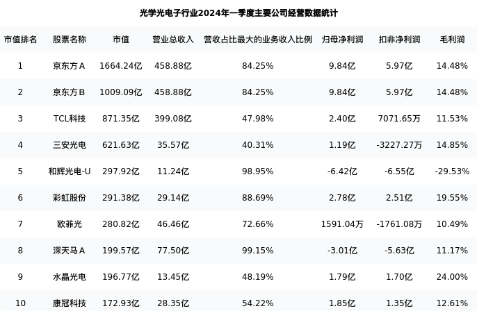 彩虹股份最新报告期数据为一季度,下表汇总了光学光电子行业内市值靠前的公司一季度主要经营数据