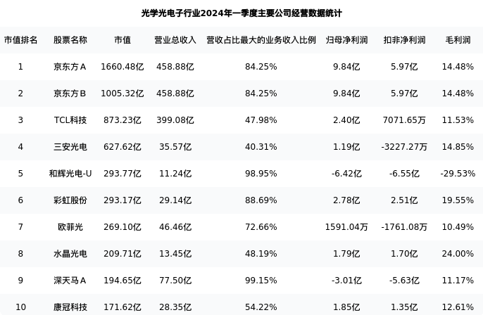 彩虹股份最新报告期数据为一季度,下表汇总了光学光电子行业内市值靠前的公司一季度主要经营数据