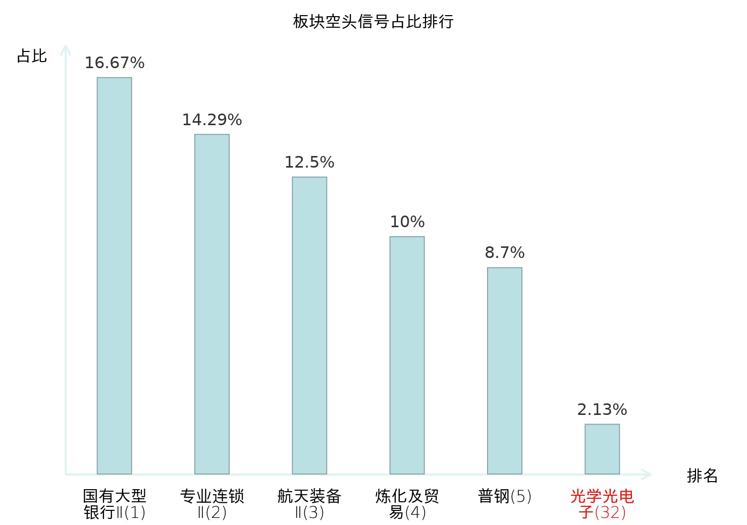 全市场所有行业板块中主力空头信号占比排名中,国有大型银行Ⅱ板块位居第一。食品加工板块名次提升最快,较昨日上升103位。