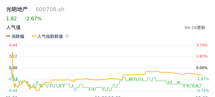 04月16日,光明地产收报1.82,股价涨幅-2.67%,成交金额5312.76万元,换手率1.31%。