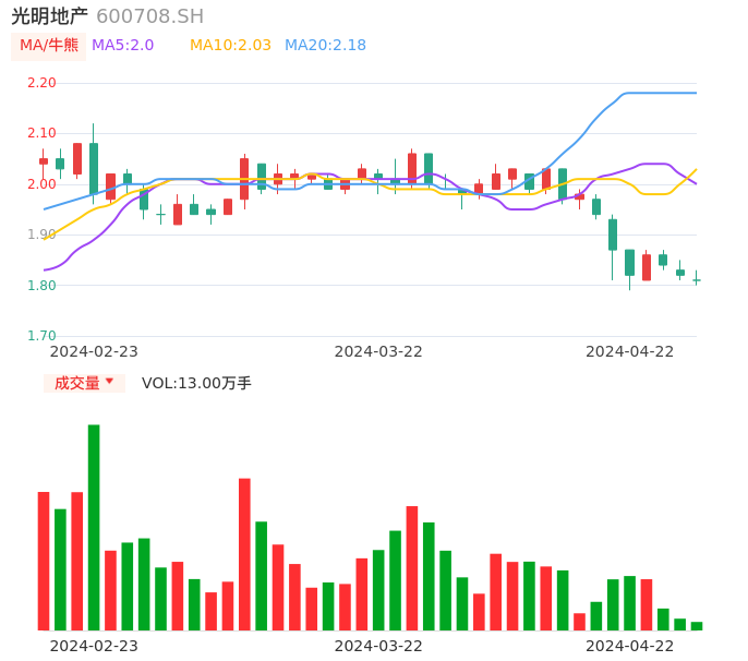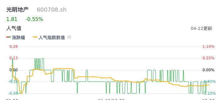 04月22日,光明地产收报1.81,股价涨幅-0.55%,成交金额2354.25万元,换手率0.58%。