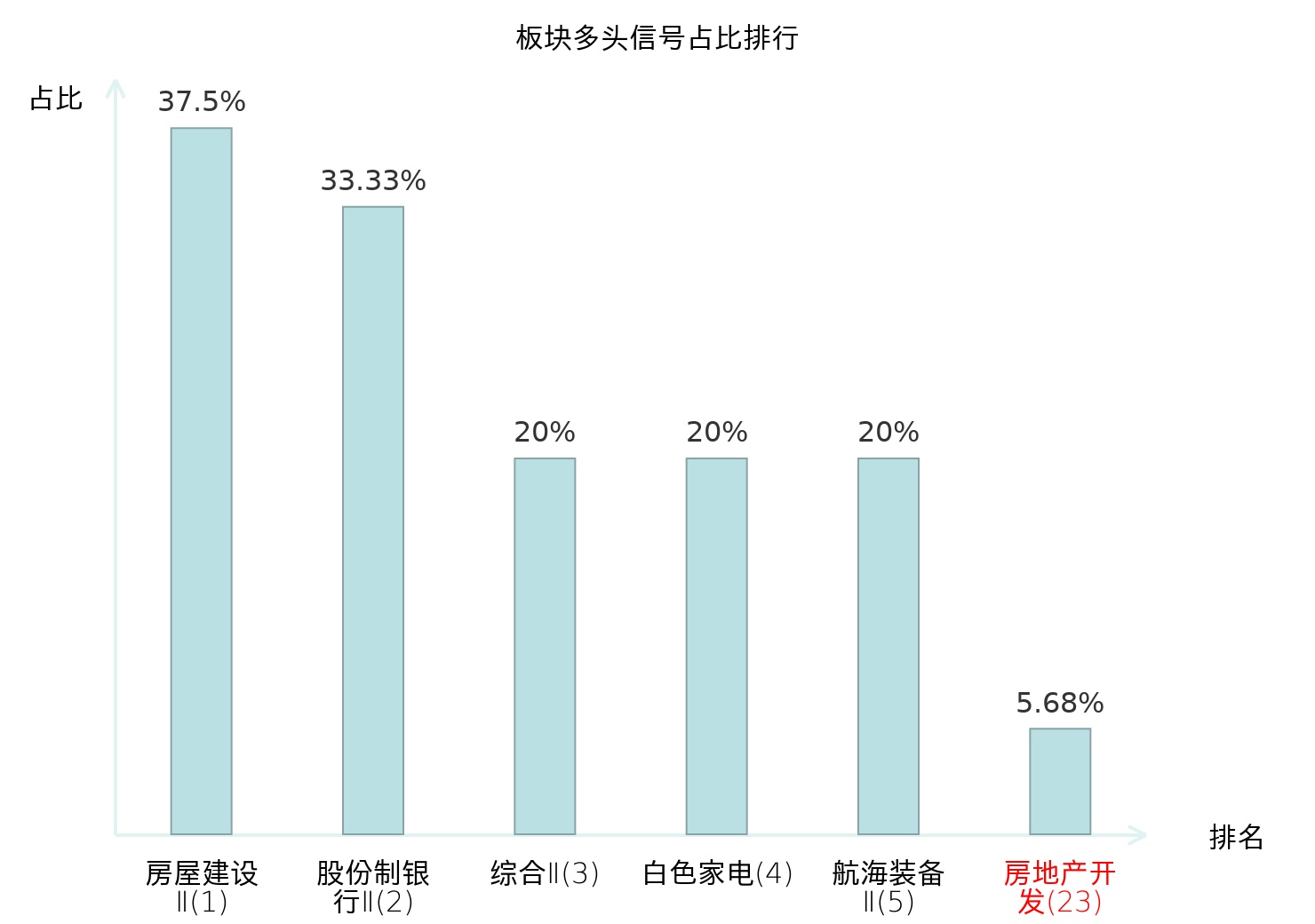 全市场所有行业板块中主力多头信号占比排名中,房屋建设Ⅱ板块位居第一。房屋建设Ⅱ板块名次提升最快,较昨日上升118位。