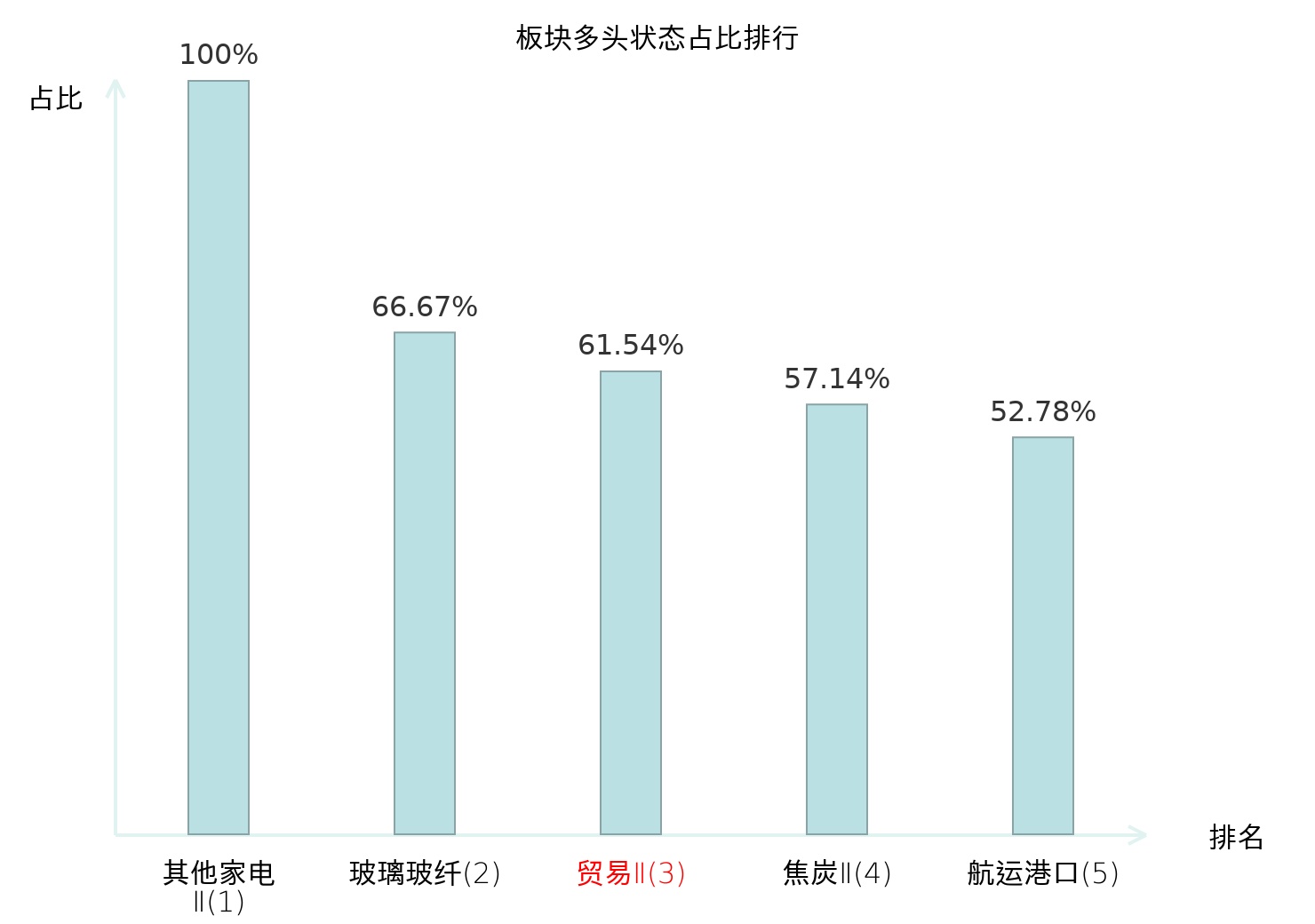 全市场所有行业板块中主力多头状态占比排名中,其他家电Ⅱ板块位居第一。影视院线板块名次提升最快,较昨日上升62位。