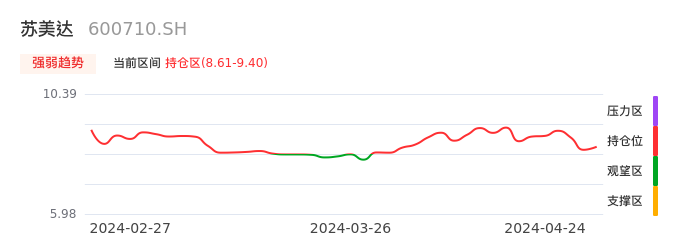 我们来看一下该股的九方特色指标强弱趋势的情况:苏美达自03月28日从观望区上穿到持仓区。股价近期在多头区域持续强势上扬,上升动能仍较为充足,可积极关注。后续重点关注上方压力位:9.40元是否能突破上攻。