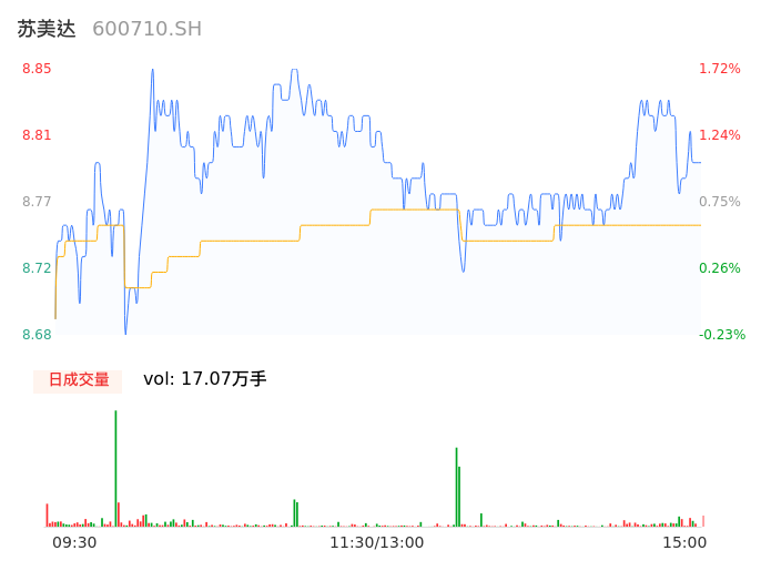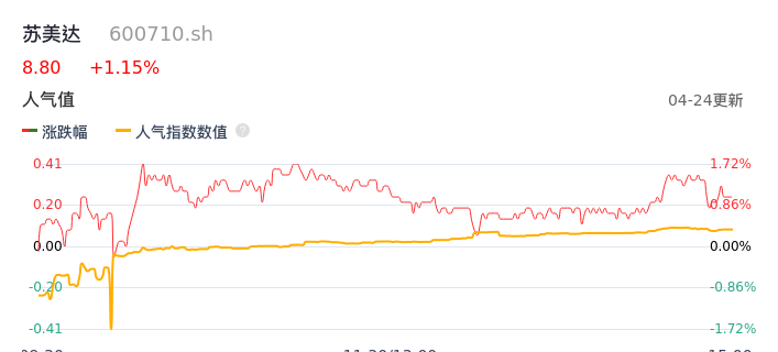 04月24日,苏美达收报8.80,股价涨幅1.15%,成交金额1.49亿元,换手率1.31%。