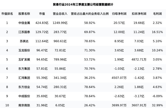 苏美达最新报告期数据为三季度,下表汇总了贸易行业内市值靠前的公司三季度主要经营数据