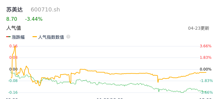 04月23日,苏美达收报8.70,股价涨幅-3.44%,成交金额1.58亿元,换手率1.37%。