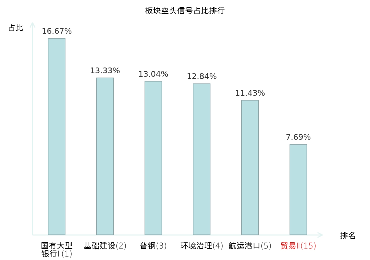 全市场所有行业板块中主力空头信号占比排名中,国有大型银行Ⅱ板块位居第一。环境治理板块名次提升最快,较昨日上升123位。