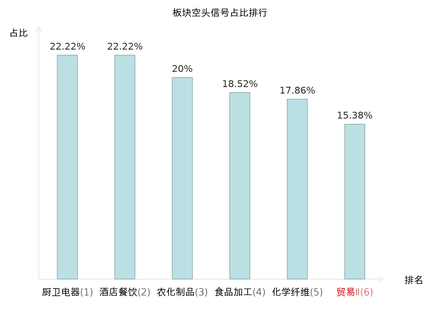 全市场所有行业板块中主力空头信号占比排名中,厨卫电器板块位居第一。化学纤维板块名次提升最快,较昨日上升119位。