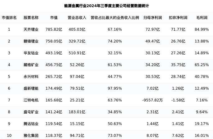 盛屯矿业最新报告期数据为三季度,下表汇总了能源金属行业内市值靠前的公司三季度主要经营数据