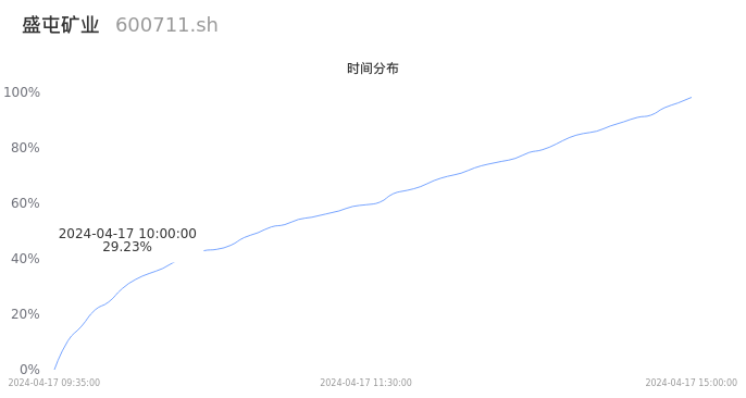 首先我们来看当日成交的时间分布。将今日交易时间按照5分钟的时间间隔进行切片,并绘制分布直方图进行观察。可以发现,10点之前的成交量占全天成交量的29.23%,这说明,该股票活跃时段换手率一般,资金热度较一般。