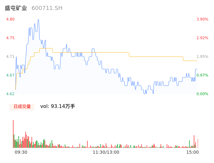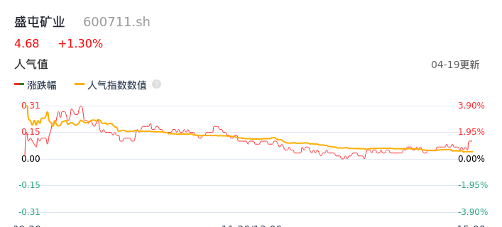04月19日,盛屯矿业收报4.68,股价涨幅1.30%,成交金额4.38亿元,换手率2.98%。