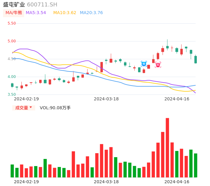 04月16日,盛屯矿业收报4.38,股价涨幅-5.81%,成交金额4.01亿元,换手率2.88%。