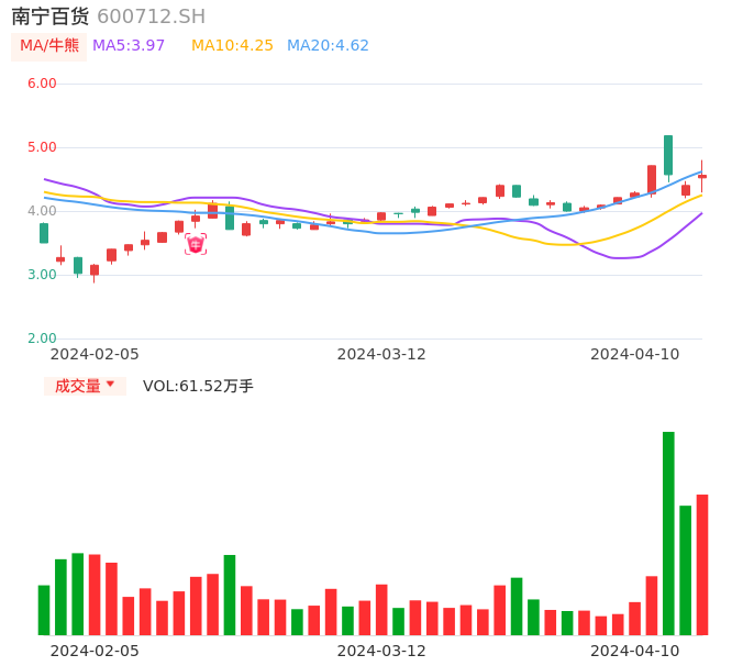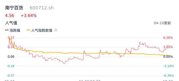 04月10日,南宁百货收报4.56,股价涨幅3.64%,成交金额2.78亿元,换手率11.42%。