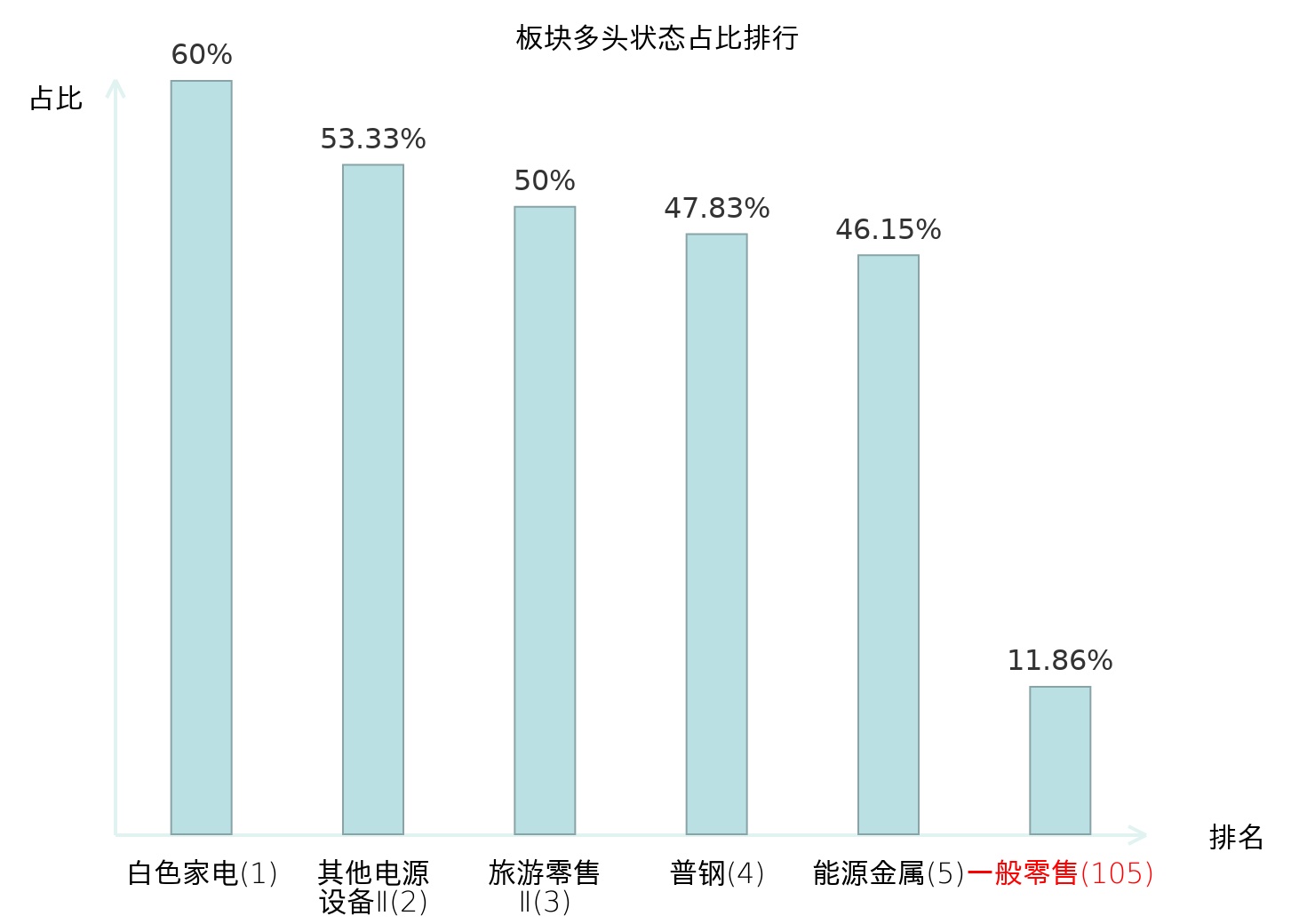 全市场所有行业板块中主力多头状态占比排名中,白色家电板块位居第一。照明设备Ⅱ板块名次提升最快,较昨日上升55位。