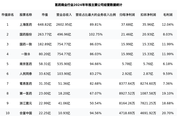 南京医药最新报告期数据为年报,下表汇总了医药商业行业内市值靠前的公司年报主要经营数据