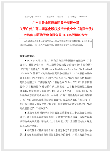 据介绍,本次交易将有利于白云山进一步加强与南京医药的业务合作,优化区域产业布局,增强医药流通业务竞争优势,并带动医药制造业务增长,持续推动公司业务发展。