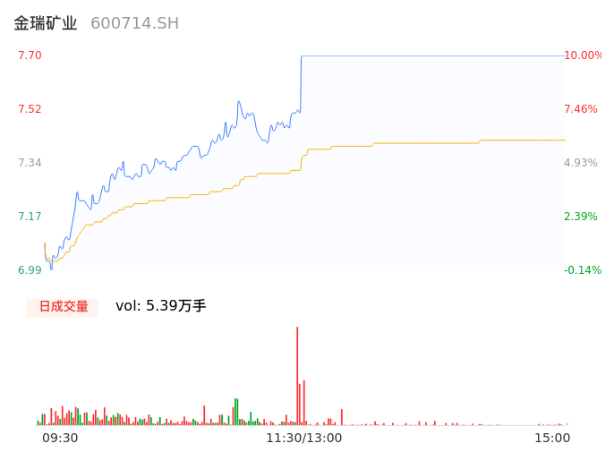 04月25日,金瑞矿业收报7.70,股价涨幅10.00%,成交金额3994.33万元,换手率1.87%。